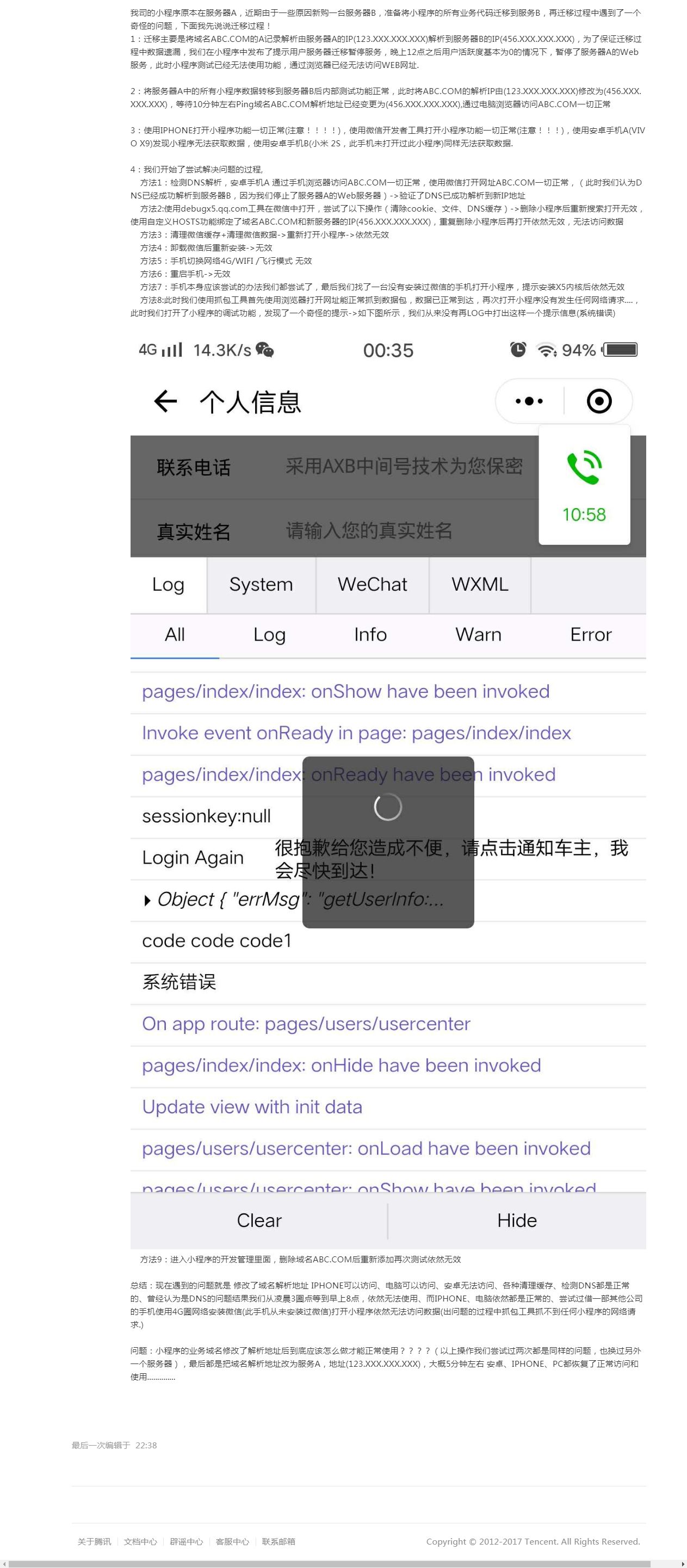 Bug表现:小程序业务域名修改解析地址后开发者工具和IOS版可以正常使用,安卓版本无法访问。