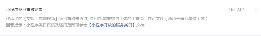 事业单位申请小程序服务类目【文娱 - 其他视频】需要提供主体的主管部门许可文件,这个有范本么?不然上传的东西老是审核不通过,急等。