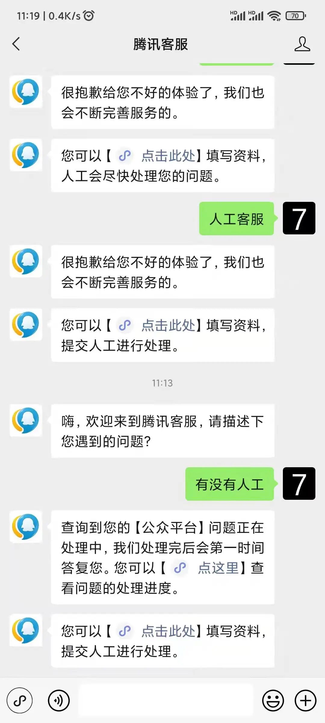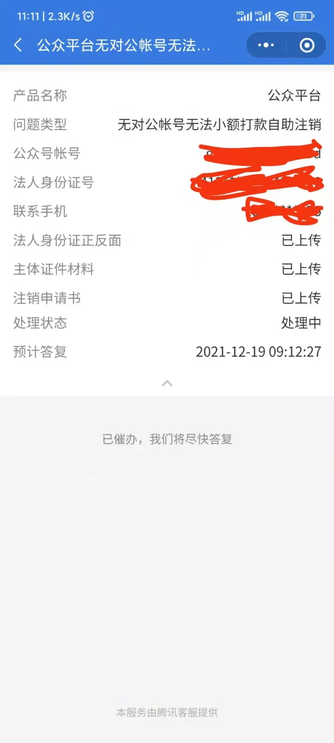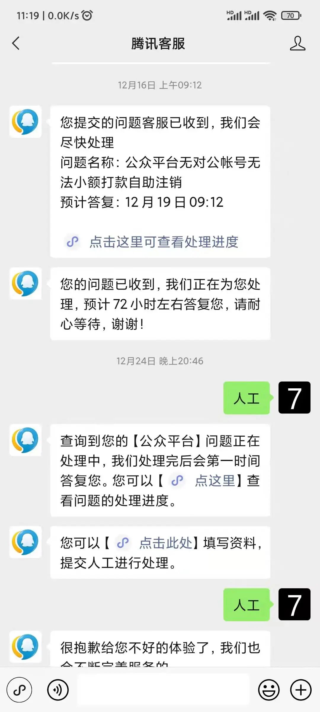 注销一个订阅号,系统提示微信找腾讯客服,然后按照相关资料填写完成后,16号提交,系统提示预计19号有回复,现在都28号了,石沉大海,期间一直点击催办,没有任何反馈,如果解决不了,直接回复解决不了,别误导大家去腾讯客服上面提交资料,提交了又不解决,白白等了十几天,这样浪费大家时间对吗?(粗话我就不说了,不给大家负面影响)