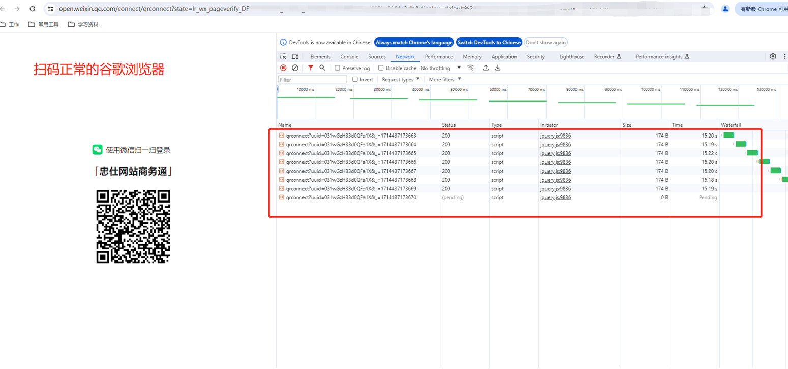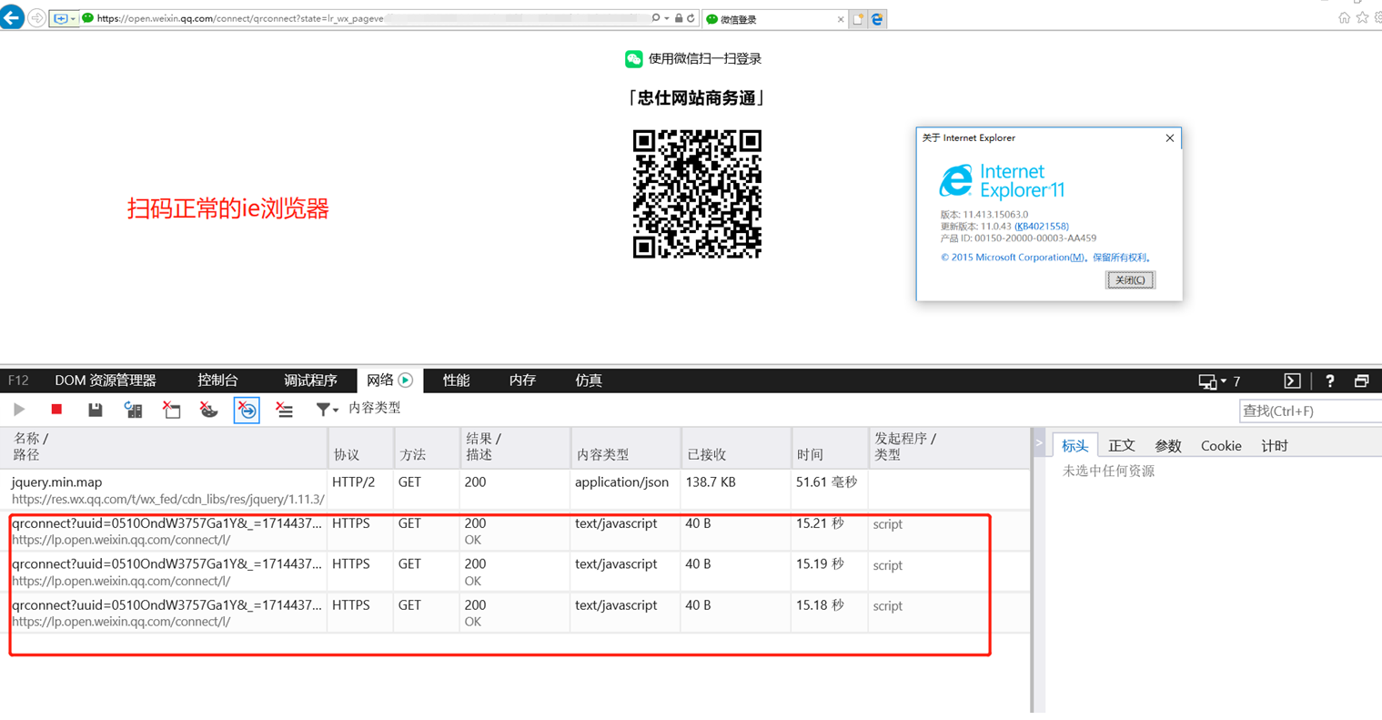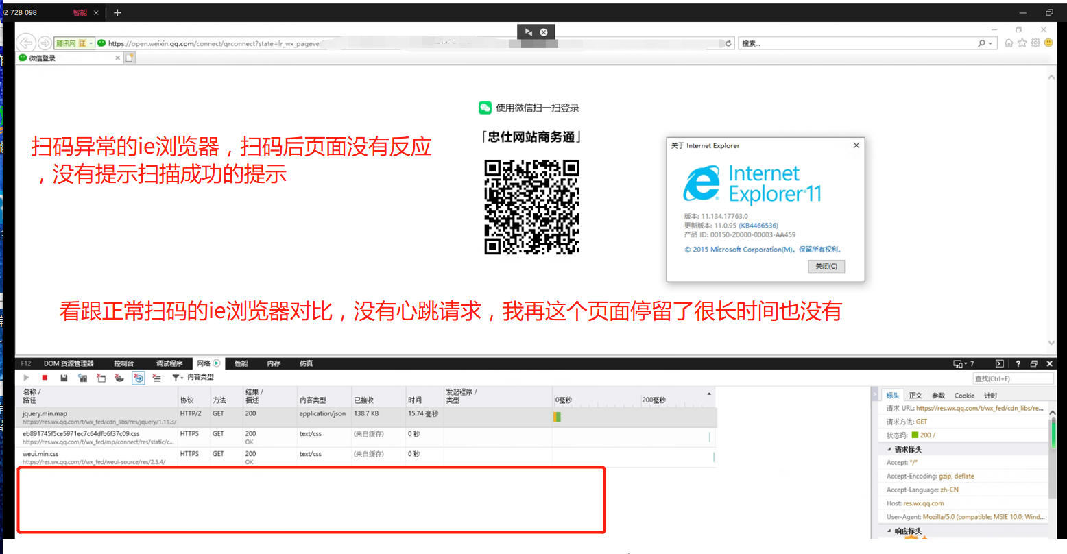 如下图所示,这个是04.30日早上远程的一个客户的电脑,扫码异常的ie浏览器,F12打开开发者工具的方式不好用,对比截图了一下,扫码异常的ie浏览器,没有 qrconnect 的心跳请求(观察这个心跳请求15秒左右一次),当时在这个页面停留了几分钟,一直这个效果,同时页面上也没有报错信息。扫码正常的ie浏览器和谷歌浏览器等,都会有qrconnect 的心跳请求。