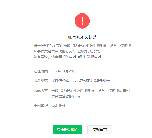 本人公众号于2024年1月29日早上被封,提示如图,请问审核人员是因什么而封,需要提供什么才能申诉解封呢。