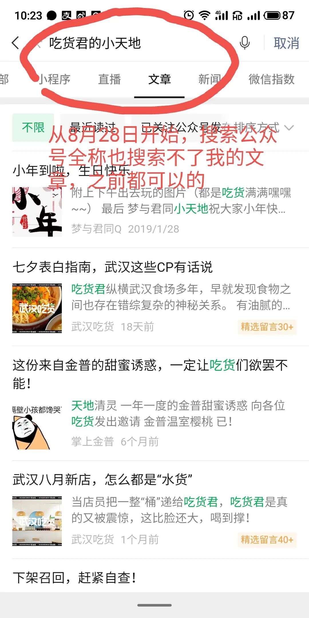 公众号申请到运营一个多月,刚开始发布的文章可以搜索到,最近发现所有文章和现在发的全部搜索不到了,搜一搜文章都搜不到~即使是全标题也搜不到