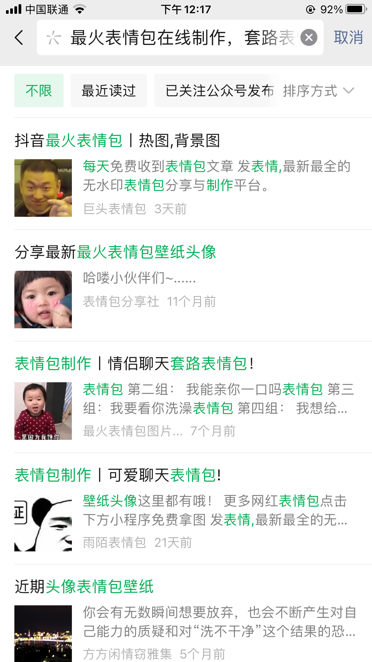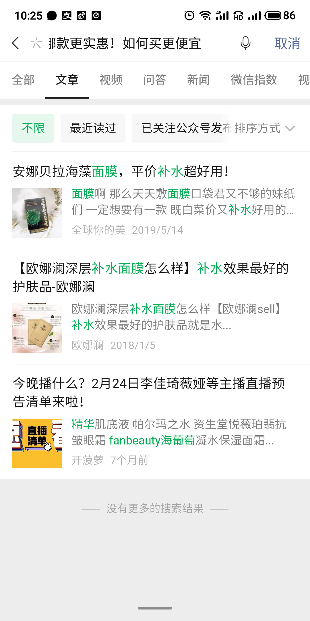 请注意搜索结果页面截图,需要点击文章模块,筛选已关注的公众号。若已关注的公众号下方有展示是符合预期