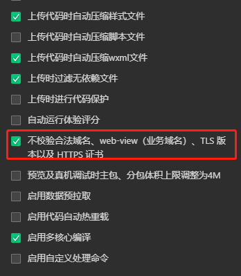 检查小程序是否配置了合法域名,工具应该是打开了忽略域名校验