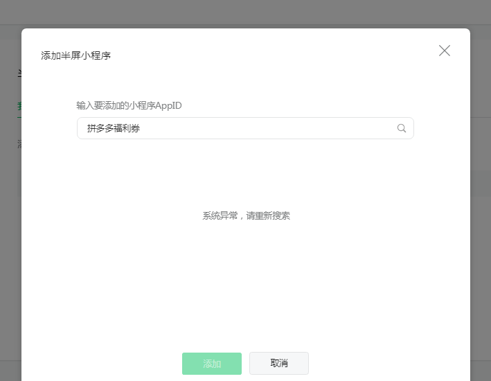 添加半屏小程序时,输入小程序名称后点击搜索报错:系统错误, ret=-1,请稍后重试,请问这个问题啥时候修复呀?
