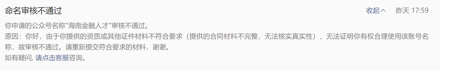 提交了与地方主管单位的运营合作合同,完整的盖章材料也提供了,但是仍然是审核不通过,具体原因在哪呢,能否给审核人员联系方式,12.12号需要地方金融人才发布会上发布“海南金融人才”公众号,时间紧迫。