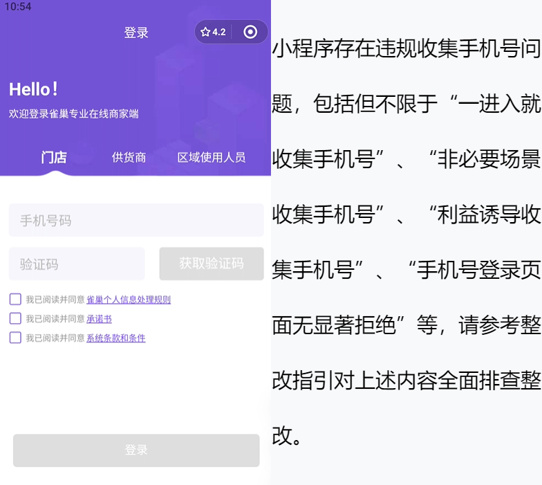 你好,若小程序属于内部应用,应在登录页清晰标注该小程序使用场景及使用人群;若非小程序的使用人群,在用户验证手机号时需要对用户有明确的拒绝提示,且用户应该可以退出当前流程,违规情况已通过站内信下发,可在mp后台登录查看详情根据站内信指引完成整改后发起申诉即可,申诉材料包括但不限于小程序服务内容录屏、页面截图、体验账号等,以便核实验证,详细规则以及整改方案可参考https://mp.weixin.qq.com/s/WHacxsm0J7D6Jb_Y_stdVA