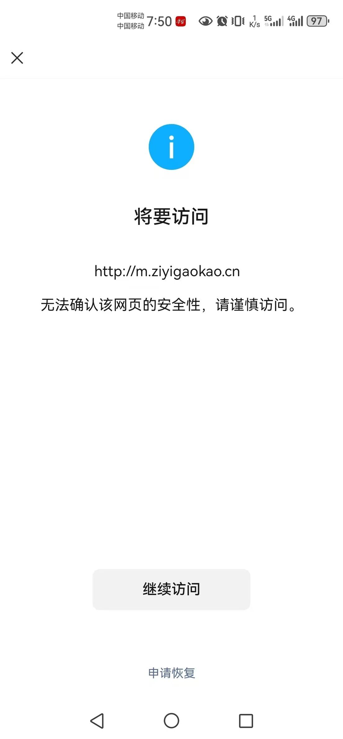 您好,域名ziyigaokao.cn在西部数码注册并通过Ucloud备案通过,浏览器访问正常,我是网站开发者,访问时间如图2025/5/13,微信识别二维码,访问网站出现“无法确认该网页的安全性,请谨慎访问。”经检查网页里没有不安全的内容,请核实后帮忙解除拦截,谢谢!