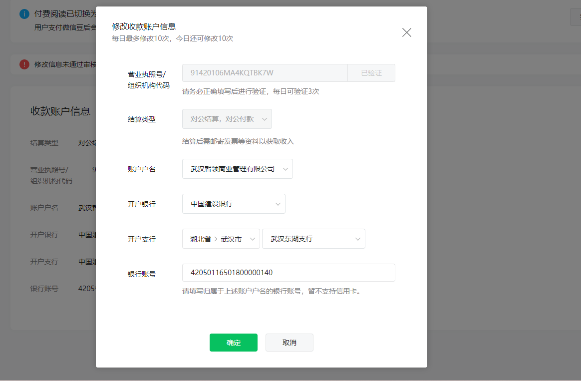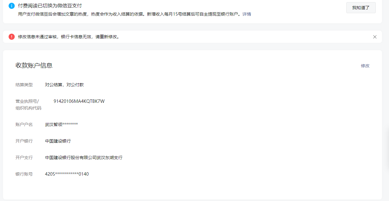你好,你确认一下你的银行卡是否可以正常收付款,以及开户行,银行卡账户名等等信息是否正确,或者你可以尝试切换其他的银行卡账号查看是否正常