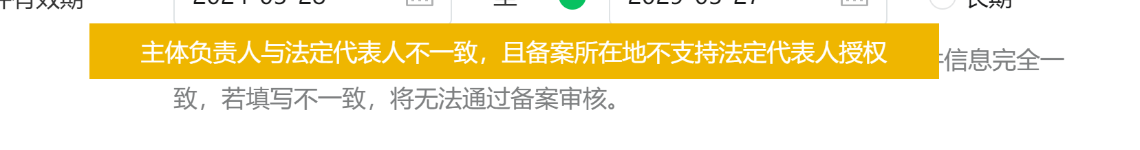 (3)当前小程序备案省市区要求主体负责人必须是法定代表人,不支持授权。