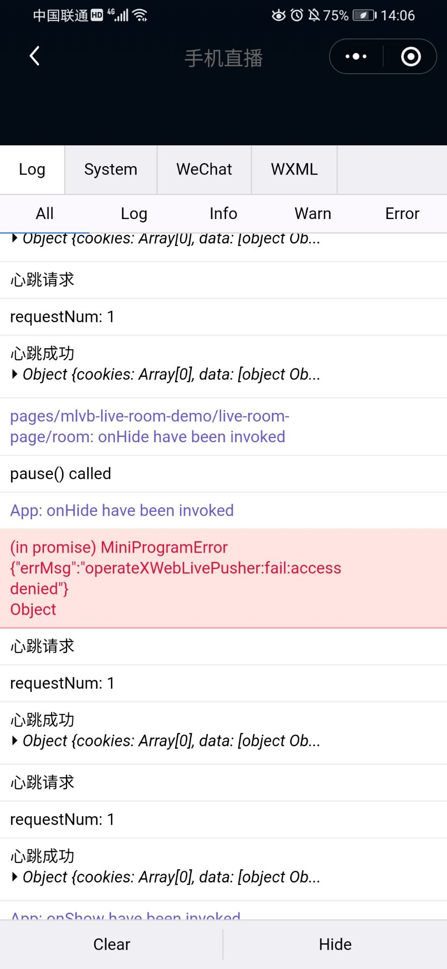 operateXweblivepusher fail access denied是什么层面的报错?,只要手机来电话了,挂断后回到小程序页面就会这样报错。