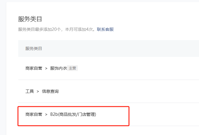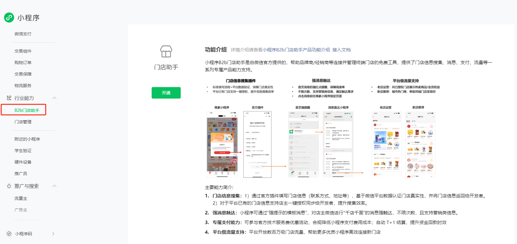 2.首先小程序要添加商家自营-B2b类目,然后菜单中将出现B2B门店助手。我的截图是没有开通。