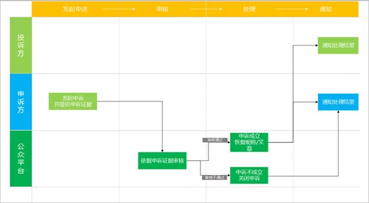 通过平台下发通知站内信中的“通知中心”发起申诉或者登录公众平台后在左下角点击“侵权投诉”,选择“我要申诉”,进入申诉流程,具体操作申诉指引流程如下: