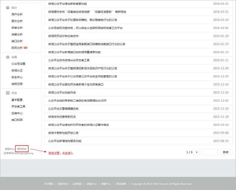 2、帐号被投诉冒充他人,并未达到仿冒标准但昵称被删除,可通过登录公众平台首页(https://mp.weixin.qq.com/)左下角侵权投诉,进入侵权投诉页面;