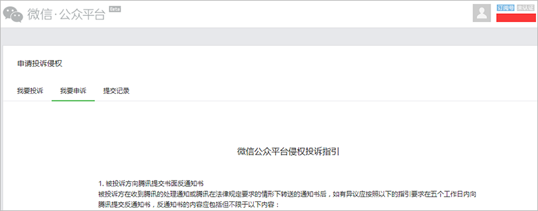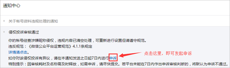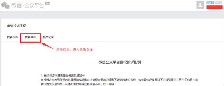 1、登录公众平台,在站内信中通过“通知中心”->“侵权投诉审核通过”下面点击“申诉”;