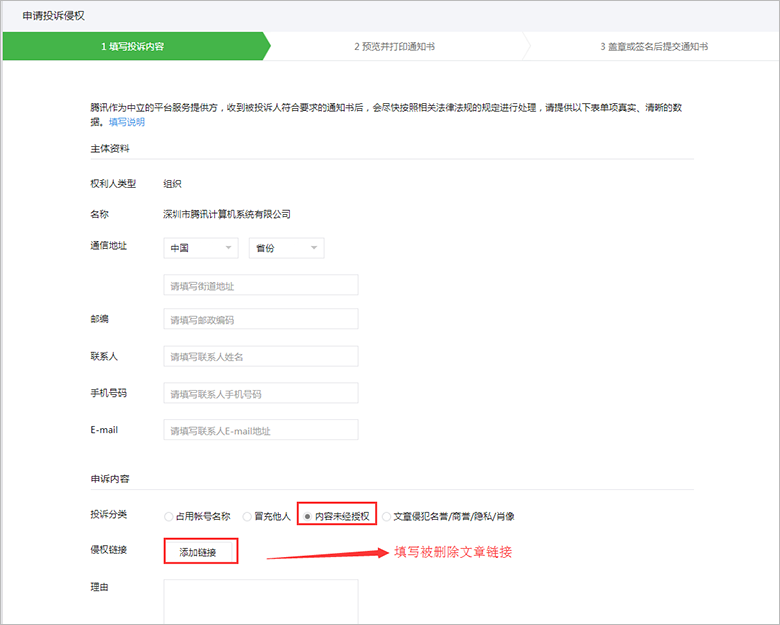 2、登录公众平台后在左下角点击“侵权投诉”,选择“我要申诉”进入申诉页面后填写资料,申诉需填写被删除文章链接。