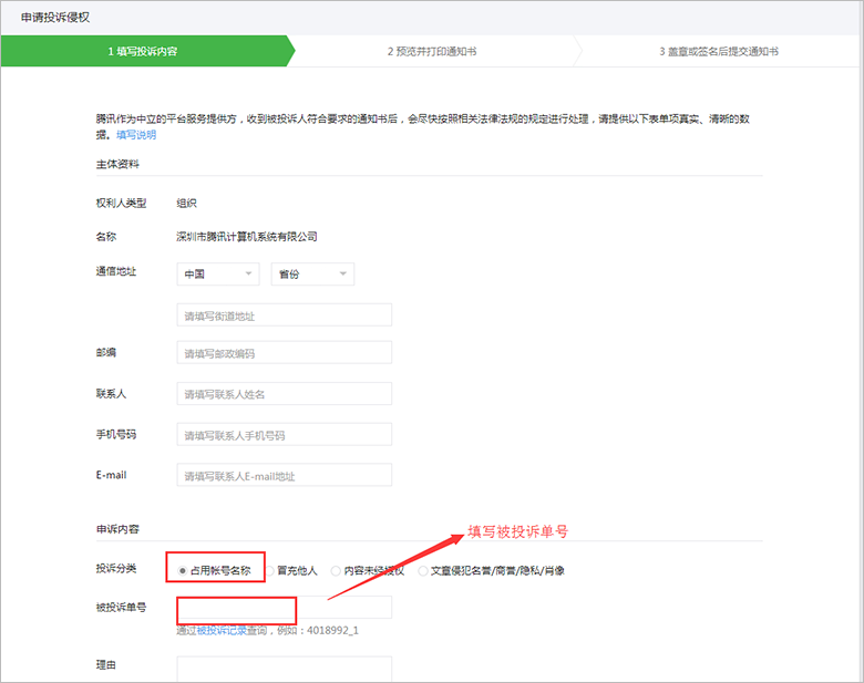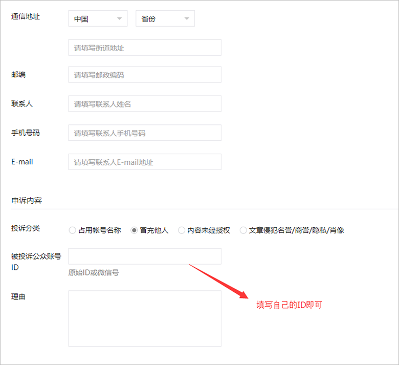 4、进入申诉页面后,选择“冒充他人”,在被投诉公众号ID中填入你的ID,进行反通知投诉 。