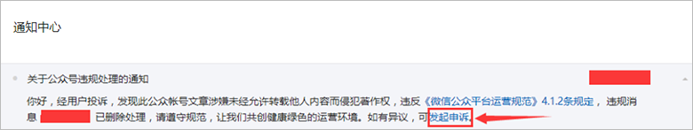 1、登录公众平台,在站内信中通过“通知中心”->“关于公众号违规处理的通知”下面点击“发起申诉”;