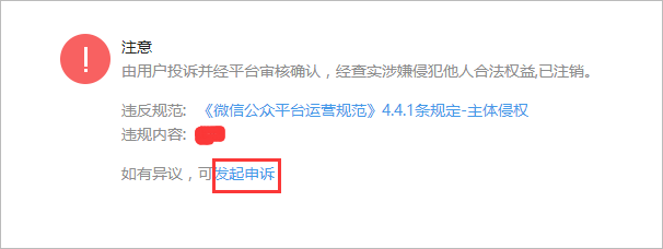当帐号被注销后,登录公众平台后会出现提示,点击“发起申诉”,即可进入申诉页面,或因在“冒充他人”投诉中未达到仿冒标准,但是被删除名称,认为自己未侵权,可发起申诉,具体操作申诉指引流程如下: