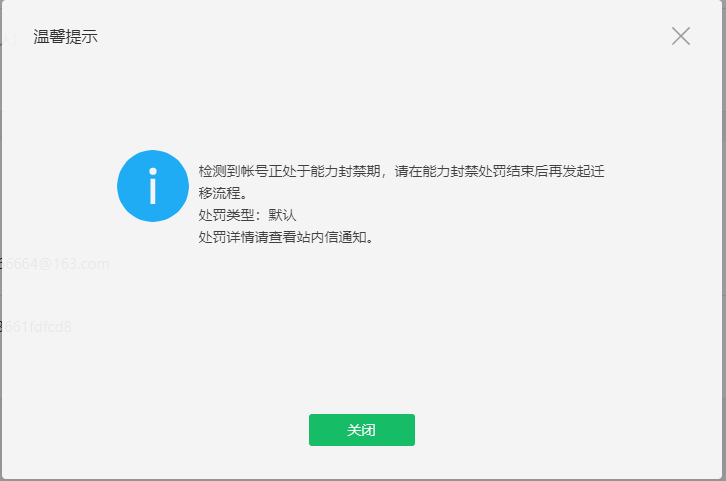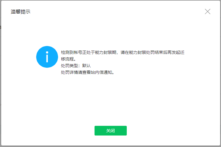 尊敬微信公众平台你好,我是一名公众号运营者,运营公众号已经一年多的时间,可是就在昨天想迁移自己的账号发现迁移不了,而且显示能力封禁期,我发现后立马查看这两个号的站内信,如图显示,没有任何的违规记录,希望官方团队审核查实