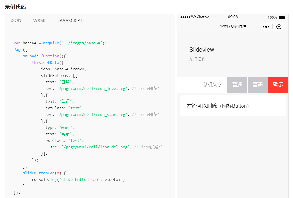 文档地址:https://developers.weixin.qq.com/miniprogram/dev/extended/weui/slideview.html