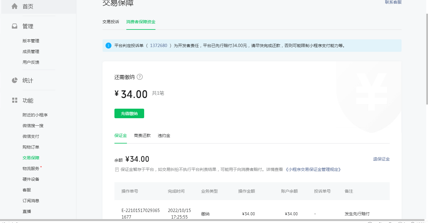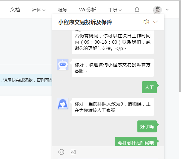 问题:小程序有笔投诉订单,平台已先行赔付34.00,当时充值缴费时页面报错,弹不出付款码。于是就充值到保证金,充完之后,之前的欠款不会自动在保证金扣取吗? APPID:wx48b2bdf279824047 真的忍不住想吐槽一下小程序客服。联系两天,第一天咨询告知:当前排队人数为23,好那就等。到了今天重新排队。告知当前排队人数为9,排了五个多小时,还在排队。我想问小程序客服一天就服务几个客户吗?真的是令人恼火,再不搞反馈问题也永远不用解决了。这工作效率真笑死人