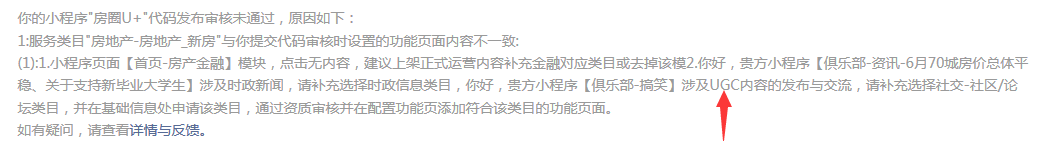 你的小程序"微商云库"代码发布审核未通过,原因如下:1:服务类目"工具-图片/音频/视频_"与你提交代码审核时设置的功能页面内容不一致:(1):小程序页面内容涉及发布UGC内容,请补充社交-社区/论坛类目,并在配置功能页面配置登记该类目。如有疑问,请查看详情与反馈。