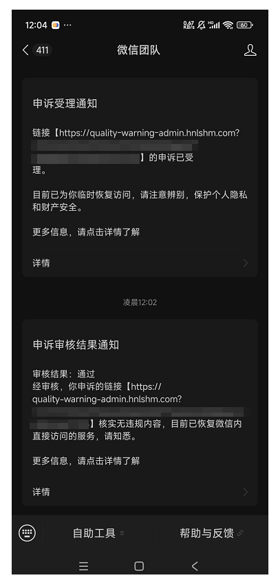情况是:我们这个被封的链接是扫码普通二维码跳转小程序,此链接下文件是空的,啥都没有,被同行恶意举报说我们欺诈,被封了;刚站长认证申诉,但是别人还是跳转不了,我们公司是做零售相关的,官方就不能人工审核一下吗,干嘛总是封我们链接,人工审核一下我们有啥欺诈内容呀,我们就是提供一个给客诉、投诉用户福利赔偿的平台,总是说我们欺诈对我们影响很大呀,大晚上的领导打电话过来要求快点解决,求求你们人工进行审核一下,手动抱歉。