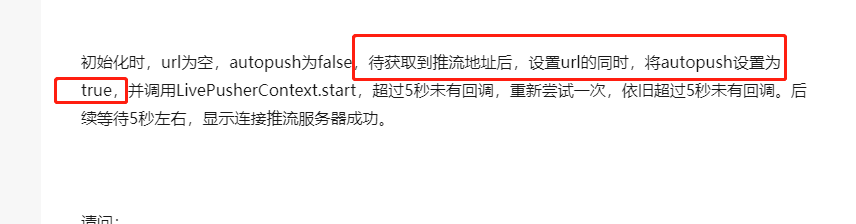 初始化时,url为空,autopush为false,待获取到推流地址后,设置url的同时,将autopush设置为true,并调用LivePusherContext.start,超过5秒未有回调,重新尝试一次,依旧超过5秒未有回调。后续等待5秒左右,显示连接推流服务器成功。