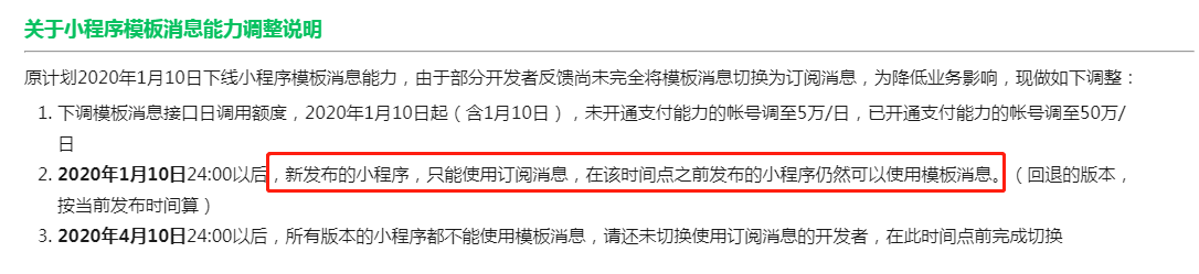 2.上周五1.10本来准备发订阅消息新版但出现了兼容了问题,赶在1.10晚上24:00前回滚了,按官方公告,我们是可以使用模板消息的...而且昨天也确实可用,但今天就不行了!