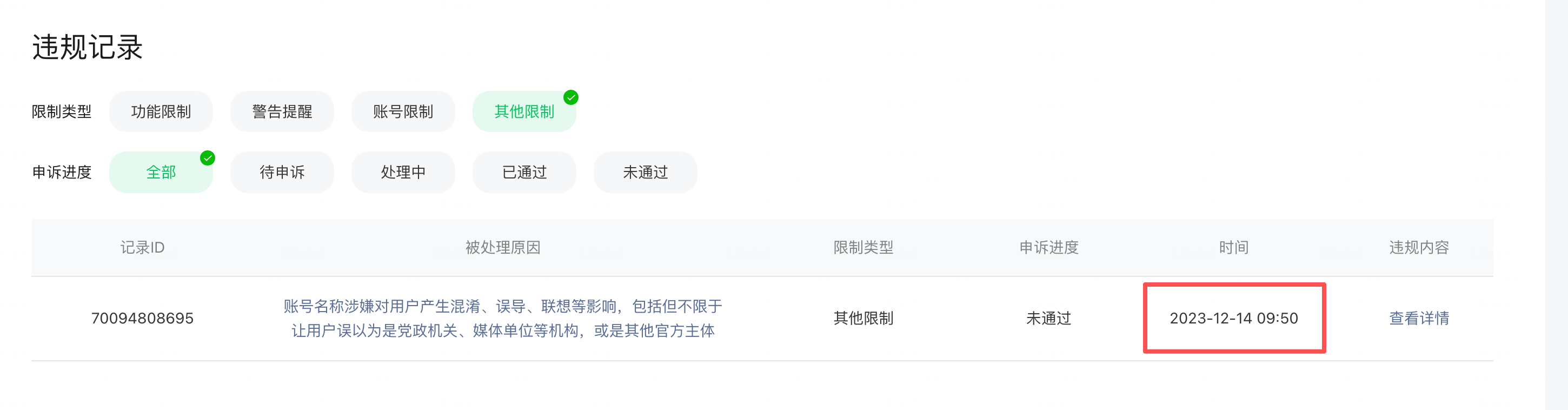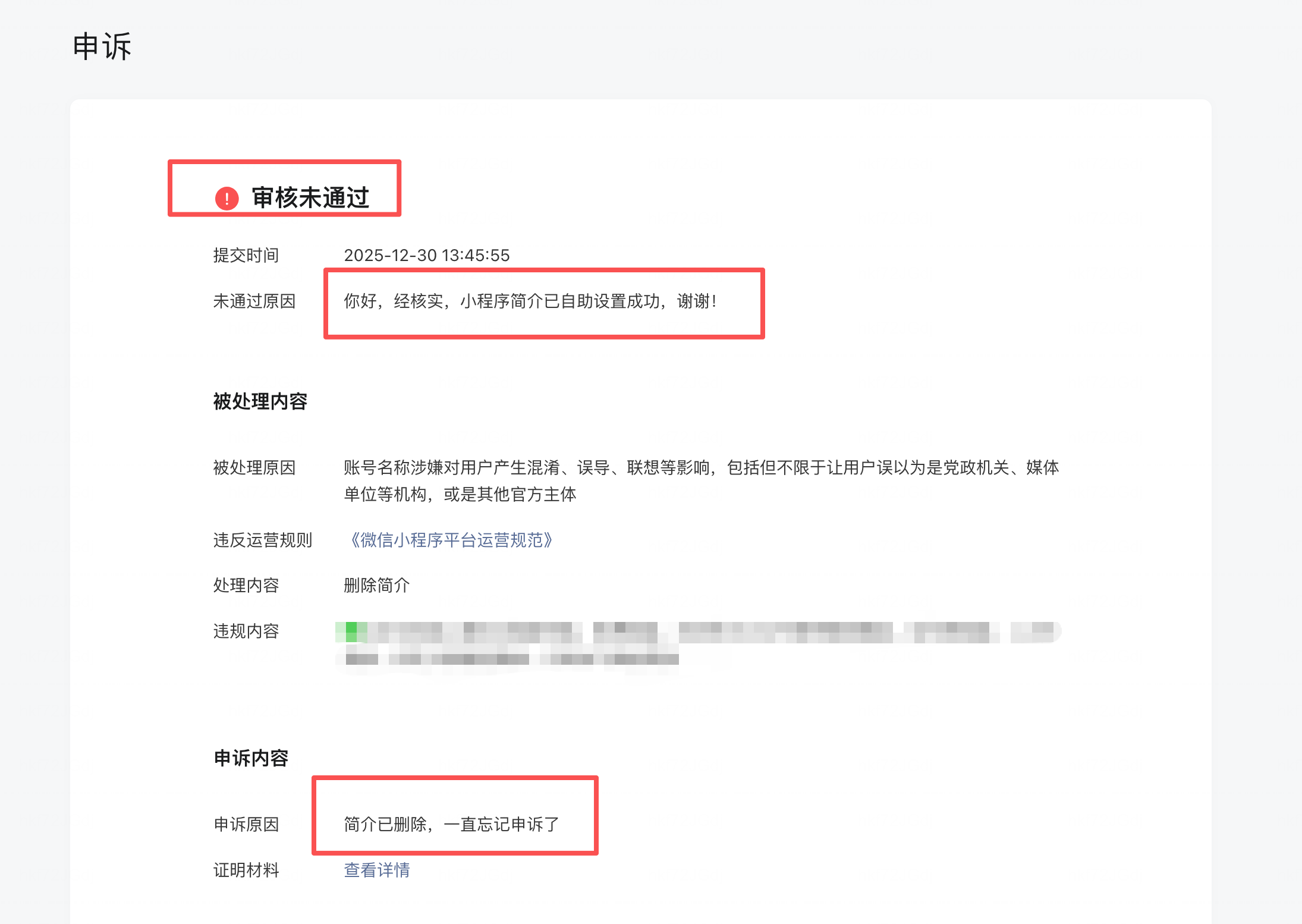 我方运营的微信小程序APPID:wx2f757d7efc522bb7,于2023年12月份因简介内容不符合规范收到系统处罚。当时因未及时知悉完整处罚规则及申诉通道,仅通过修改简介内容进行整改,未完成正式申诉流程。