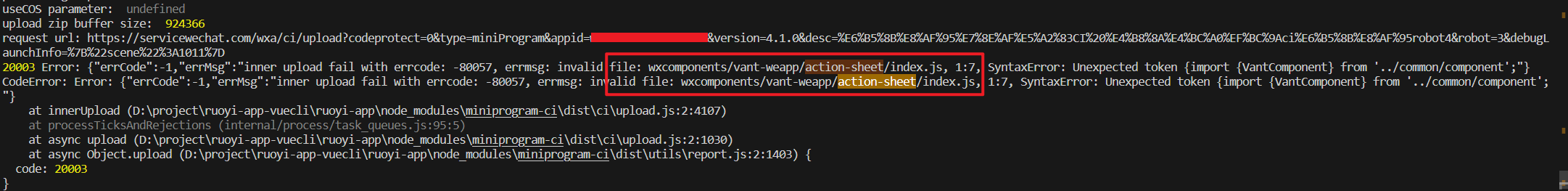 使用miniprogram-ci upload脚本上传包报错。直接使用“微信开发者工具”上传代码正常。对应的强制编译为ES5配置也都加上了。