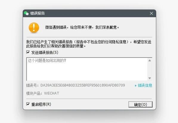 PC端微信闪退,这个问题持续了好几年了,从公司电脑到家里的电脑,再到笔记本,MAC笔记本没遇到,就是WIN系统,一直没有解决,太差劲了现在微信团队。