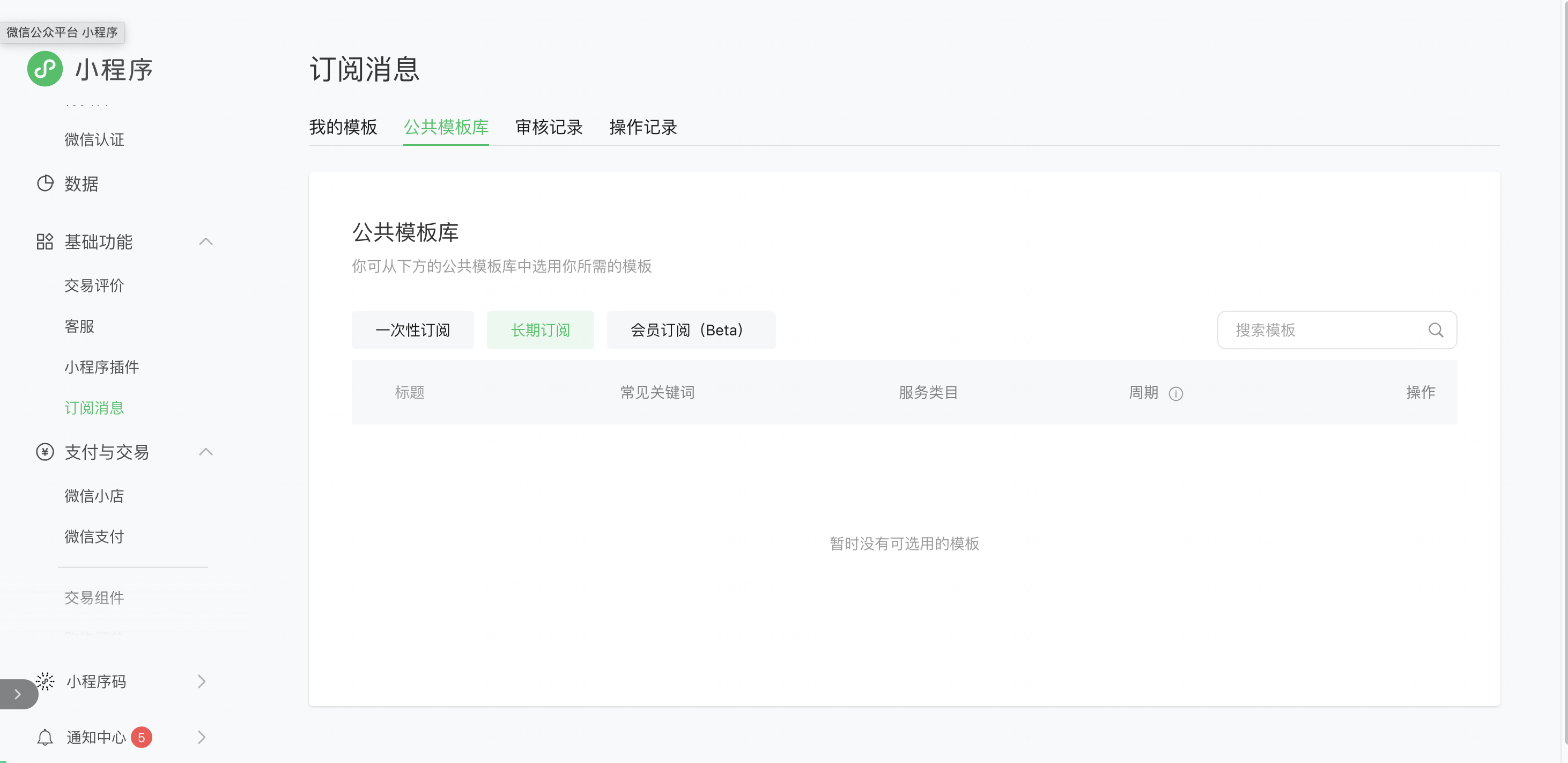 小程序类目有出国留学,信息查询和在线教育,但点进公共模版库没有任何长期订阅模版
