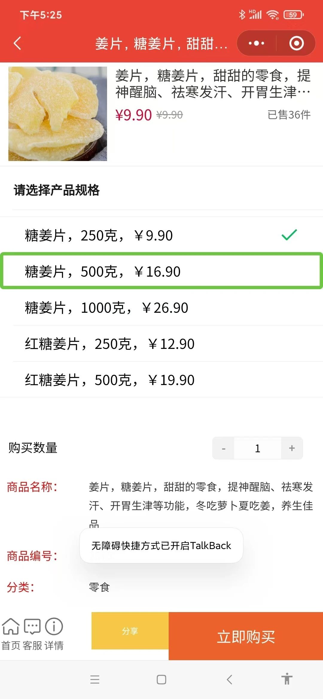 如图所示,开启talkback读屏是无法选择规格的