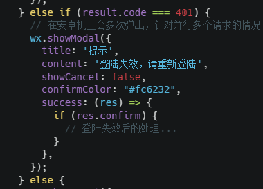 // 全局 let isShowModal = false; // 401 里面的函数逻辑 isShowModal = true; if(isShowModal){ wx.shaowModal({ title: ‘提示’, content: ‘...登录’, success:res=>{ isShowModal = false } }) }