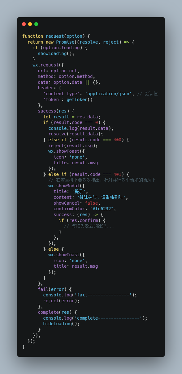 说明一下,为什么会有多个请求,小程序用户一段时间没有使用小程序,重新进入首页的情况下,首页有多个ajax请求,这时候登陆状态已经失效了,从而进入401状态码的判断分支中