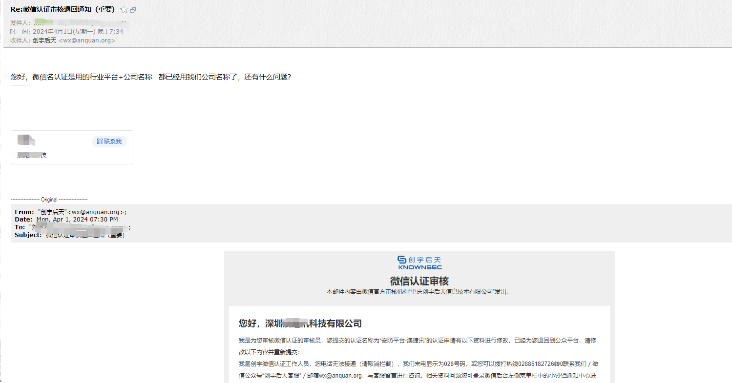 我填写的名称已经用我方公司名称,对方只在最初两次联系我方,但没有接通后同,不予以通过,之后开始,无论怎么提交信息,对方都不给予通过,也不与我方联系,我方回复对方邮件,对方也视而不见不予以回复邮件,对方公司电话也无法拔通;导致小程序认证了快一个月都无法通过;