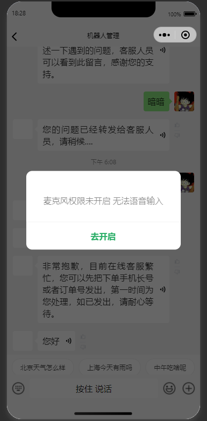 在微信机器人客服中,目前配置了语音,但还是无法输入语音,提示麦克风全新未开启