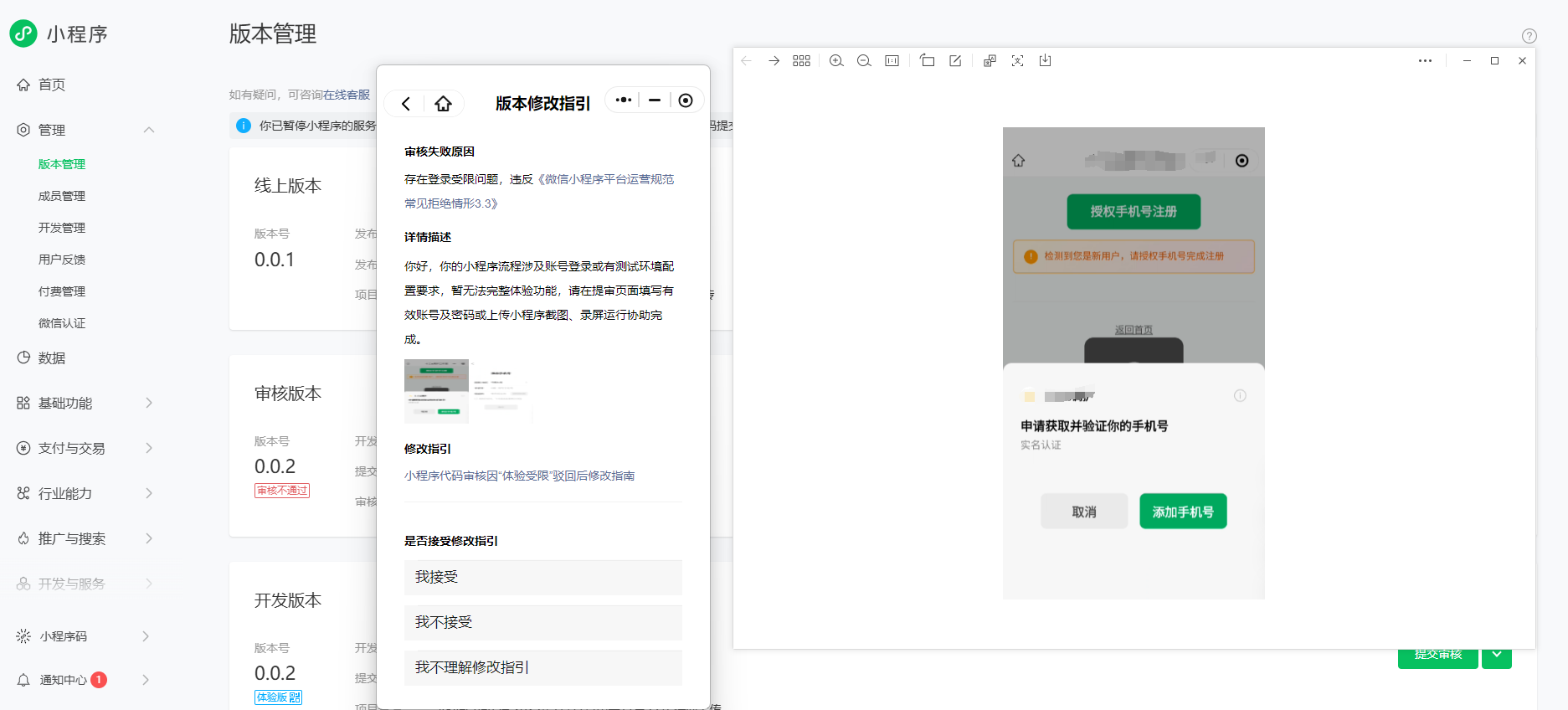 我们的小程序新用户需要验证获取用户手机号注册,登录也是。你们审核的微信号没有绑定手机号,体验不了小程序和我们有什么关系呢?真是莫名其妙