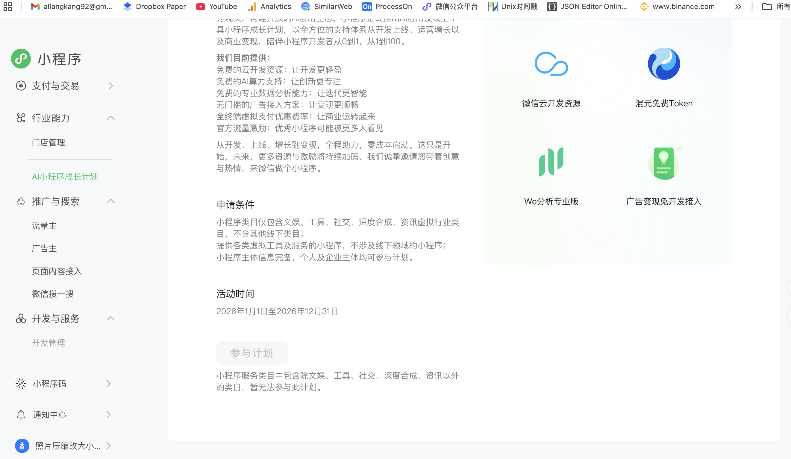 我在为我的小程序申请“AI小程序成长计划”时,遇到了系统拦截问题。活动页面的参与计划按钮呈灰色,下方提示:“小程序服务类目中包含除文娱、工具、社交、深度合成、资讯以外的类目,暂无法参与此计划。”