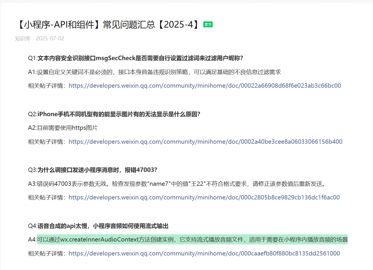 这个问题,我研究了好几天,好像小程序没有流式的接收(如果有的话,请Q我,谢谢!!!),我用的方案是按标点符号切分句子,只要第一个句子加载完成就可以播放,播放的时候会加载之后的句子(这里用户感知不到)。可以设计第一个句子,让它短一些,就可以把这个问题掩盖起来,本身句子之间的停顿就掩盖了播放多个文件之间的间隔