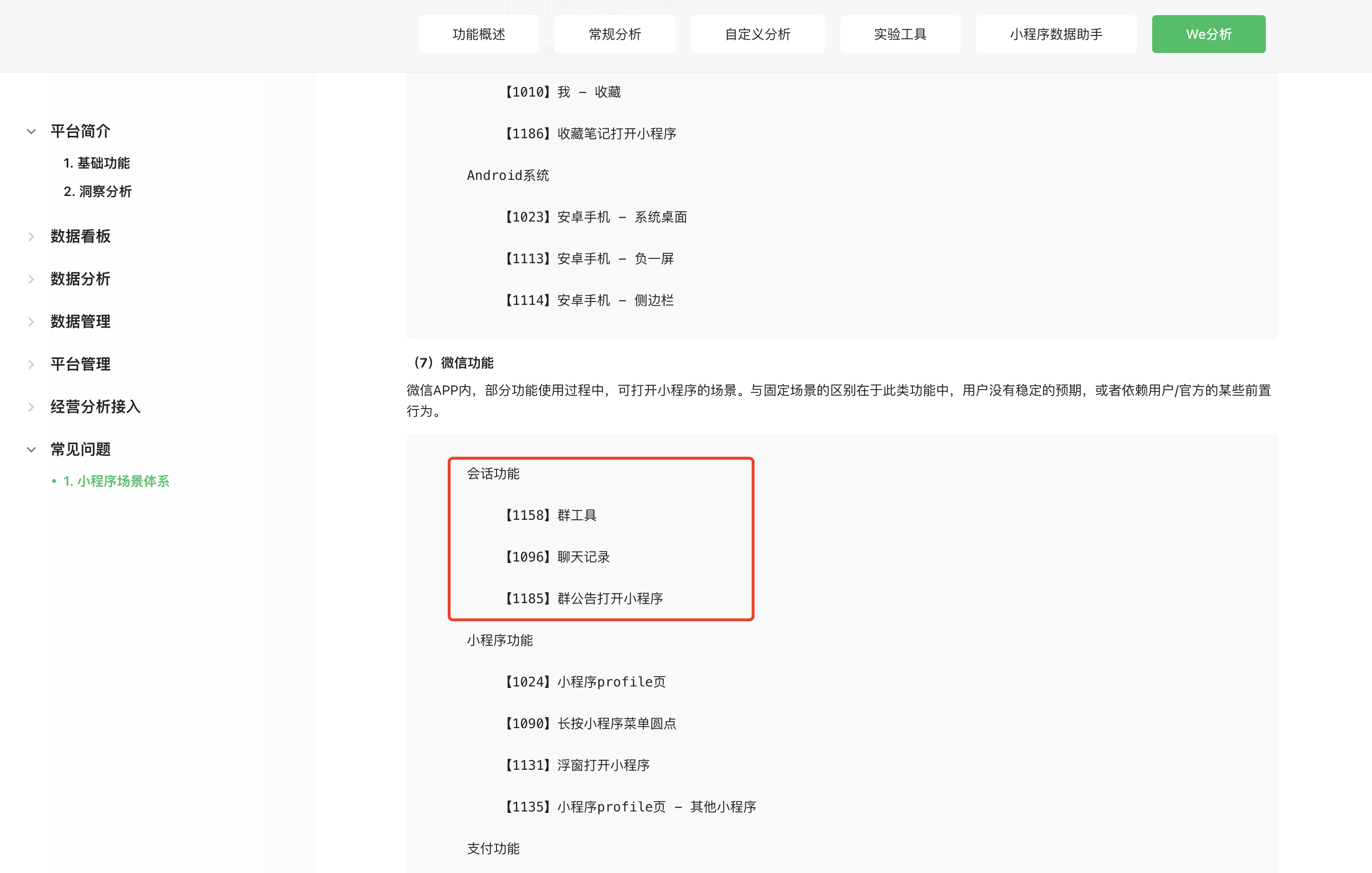 具体可查看文档,链接为:https://developers.weixin.qq.com/miniprogram/analysis/wedata/FAQ.html#_1-%E5%B0%8F%E7%A8%8B%E5%BA%8F%E5%9C%BA%E6%99%AF%E4%BD%93%E7%B3%BB