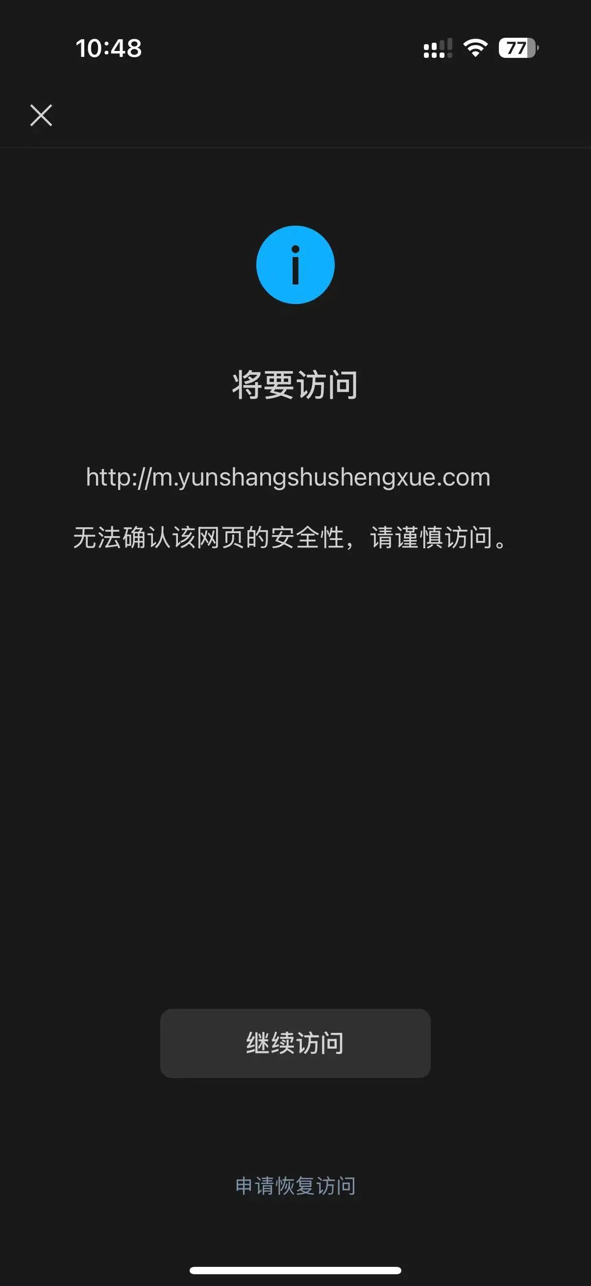 您好,域名yunshangshushengxue.com在西部数码注册并通过优刻得备案通过,http://m.yunshangshushengxue.com/浏览器访问正常,我是网站开发者,访问时间如图2026/1/29,点开网址提示“无法确认该网页的安全性,请谨慎访问。”经检查网页里没有不安全的内容,请核实后帮忙解除拦截,谢谢!尽快处理,急急急,现在需要打开使用,谢谢!