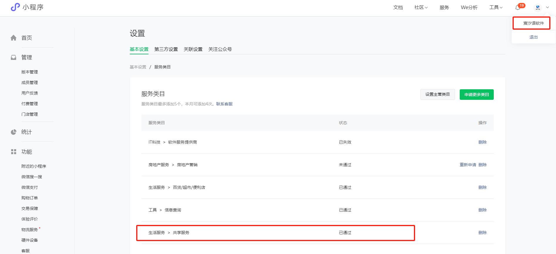 同一个企业主体类型的小程序(appId:wx926f573941e4fbf7),设置类目为生活服务-共享服务,在官方小程序后台可以设置成功,但是授权给服务商去设置的时候会报错{"errcode":53302,"errmsg":"当前账号主体类型不允许设置此种类目 rid: 666ea18f-6ecc7aeb-699d65e0"},这是为啥呢?