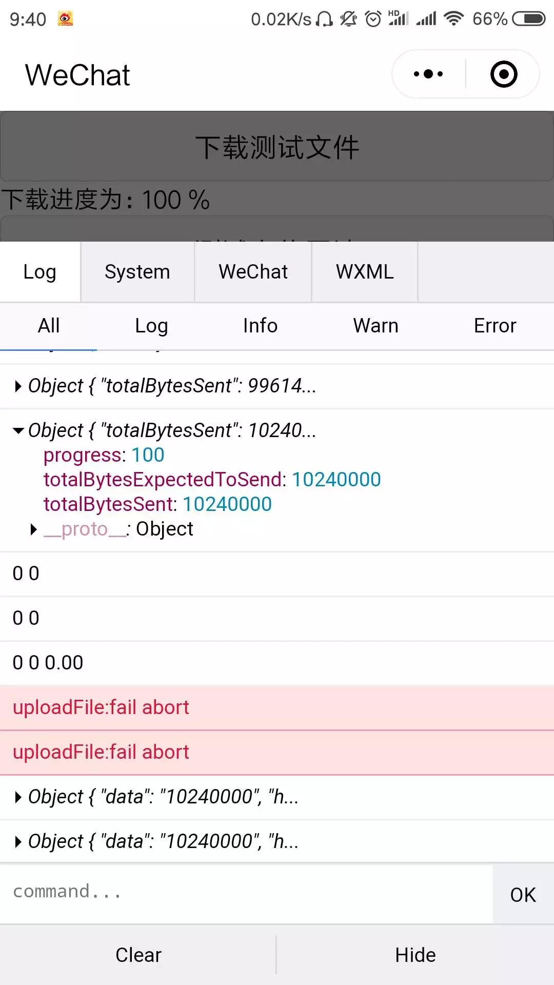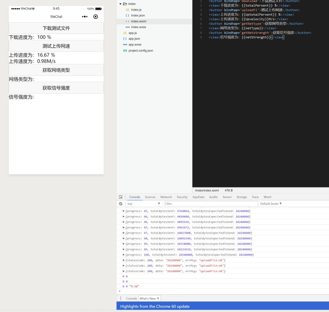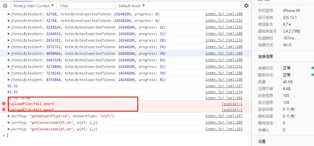 使用wx.uploadFile上传时开两个进程,每个进程上传代码文件三次,根据上传情况与时间计算上传速度,是要实现这样一个需求,再开发者工具中以项目模板打开时功能可实现,以代码片段模板和真机环境时功能异常,具体表现在: