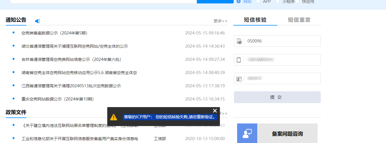 已通过平台初审,主体负责人已收到短信,24小时内前往工信部网站验证,确认输入的验证码、手机号和证件后6位均正确,仍然提示核验失败;如果选择重发短信,则提示“暂无待短信核验的备案申请,无需重发短信”。