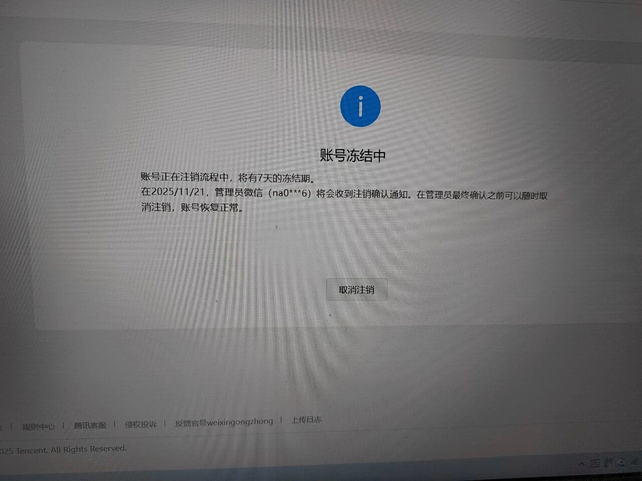 公众号注销已过7天冻结期,显示2025/11/21,管理员微信na001666会收到注销确认通知,乞今为止未有收到任何信息