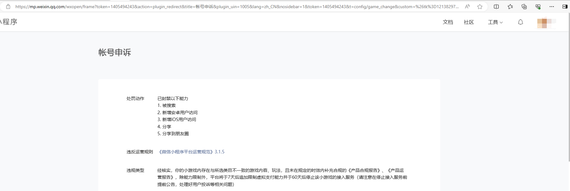 1:现在游戏被判违规:“经核实,你的小游戏内存在与所选类目不一致的游戏内容、玩法,且未在规定的时效内补充合规的《产品合规报告》、《产品运营报告》,除能力限制外,平台将于7天后追加限制虚拟支付能力并于60天后停止该小游戏的接入服务(请注意在停止接入服务前提前公告,处理好用户投诉等相关问题)”(可查看下图)