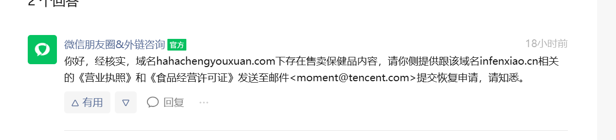 你好,经核实,域名hahachengyouxuan.com下存在售卖保健品内容,请你侧提供跟该域名infenxiao.cn相关的《营业执照》和《食品经营许可证》发送至邮件<moment@tencent.com>提交恢复申请,请知悉。